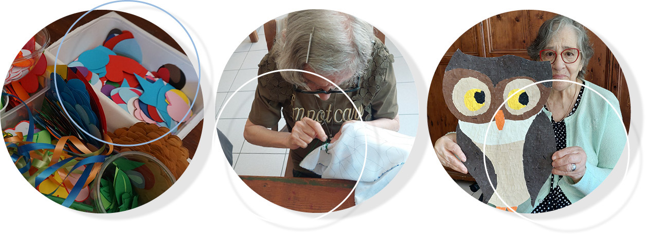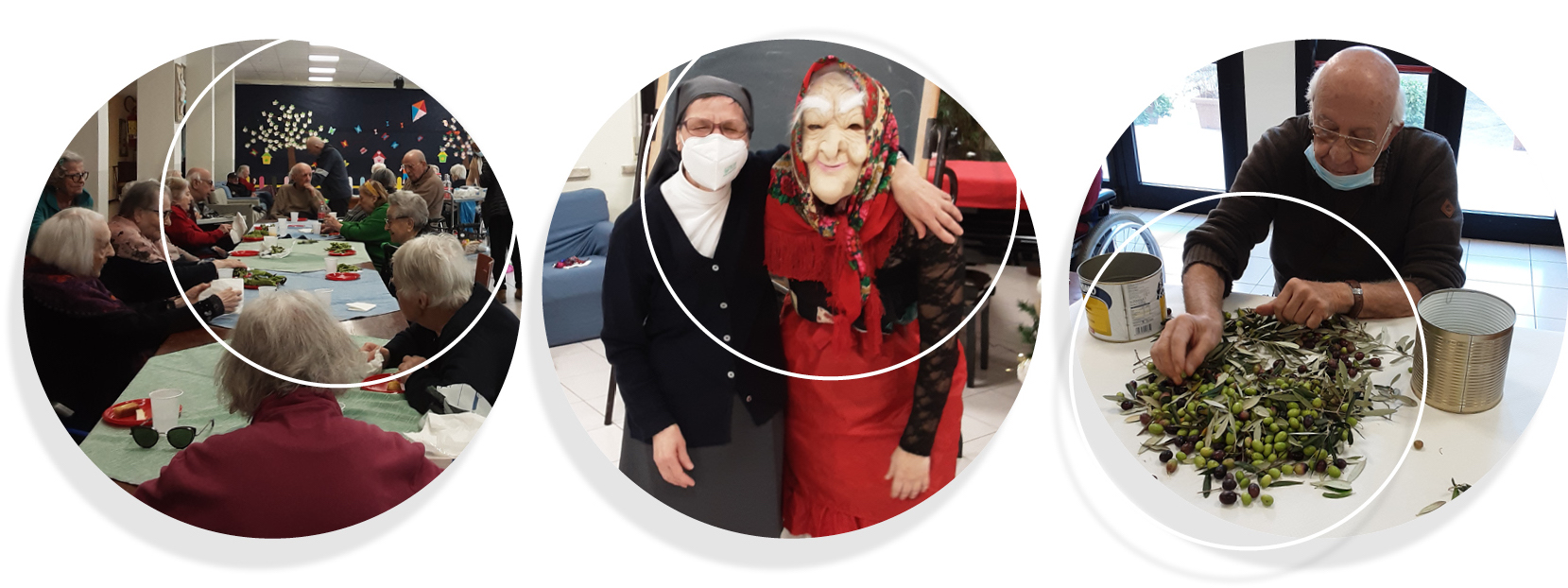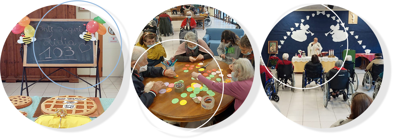 Attività quotidiane particolari. Le attività programmate come da progetto annuale, finalizzate a mantenere vive le capacità mnestiche, motorie, psichiche, le abilità personali, il senso della realtà e l’autostima. _ Laboratorio musicale: produzione e ascolto di canzoni e musiche; ballo e costruzione di semplici strumenti _ Laboratorio per la mente: attività di enigmistica, giochi di memoria, quiz _ Laboratorio manuale: taglio, cucito, ricamo e maglieria, cucina, grafico pittoriche e manipolative _ Laboratorio letterario: confronto e dibattito su temi socio-culturali, politici, storici _ Visione di films e documentari in solennità, ricorrenze o per sollecitare discussione su tematiche generali e di attualità. _ Addobbo dei locali in festività e ricorrenze, organizzazione di feste