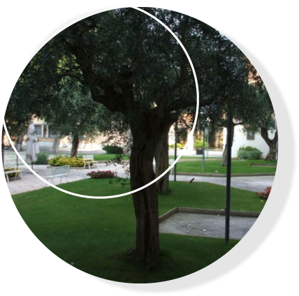Sono presenti due aree di esclusiva pertinenza della casa di riposo. La prima sul fronte, lungo le vie Napoli e Trento in prossimità dell’ingresso, con una superficie di circa 750 mq, destinata in parte a verde, in parte a spazio pedonale e spazio carrabile per la sosta di mezzi della Casa. La seconda ha una superficie di circa 1.250 mq nella corte interna del complesso, recintata, organizzata con spazi verdi e spazi per la sosta dei mezzi della Casa e di servizio.